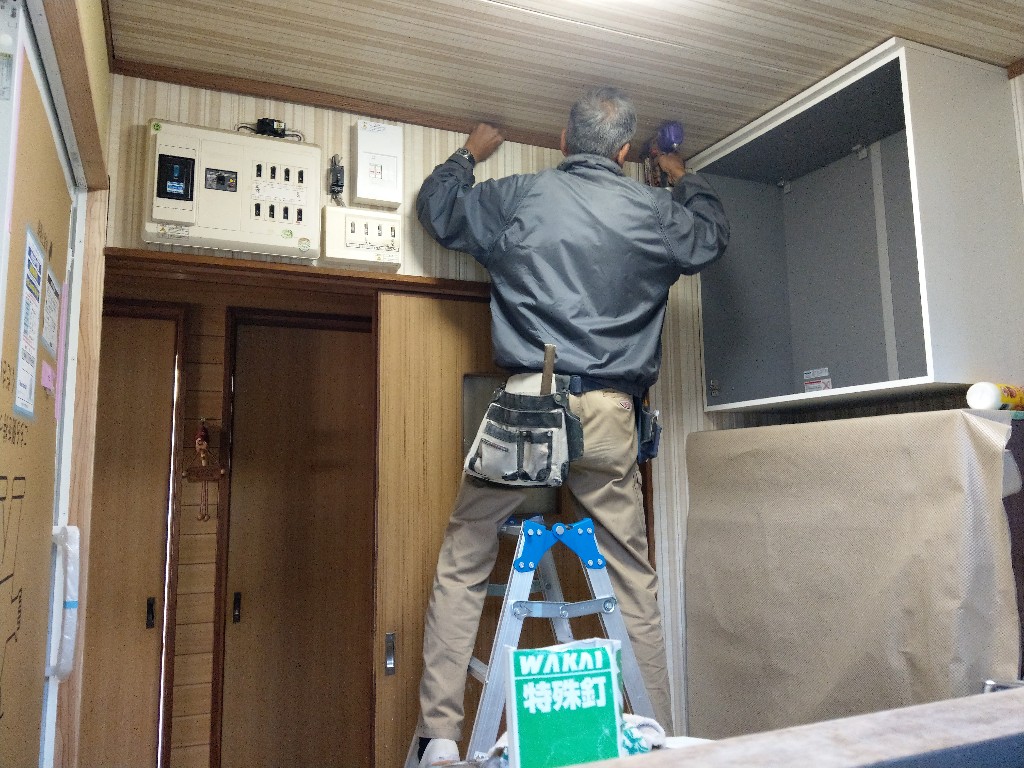 一日で壁、造作三方枠、吊戸棚取付、廻り縁、床見切りまで