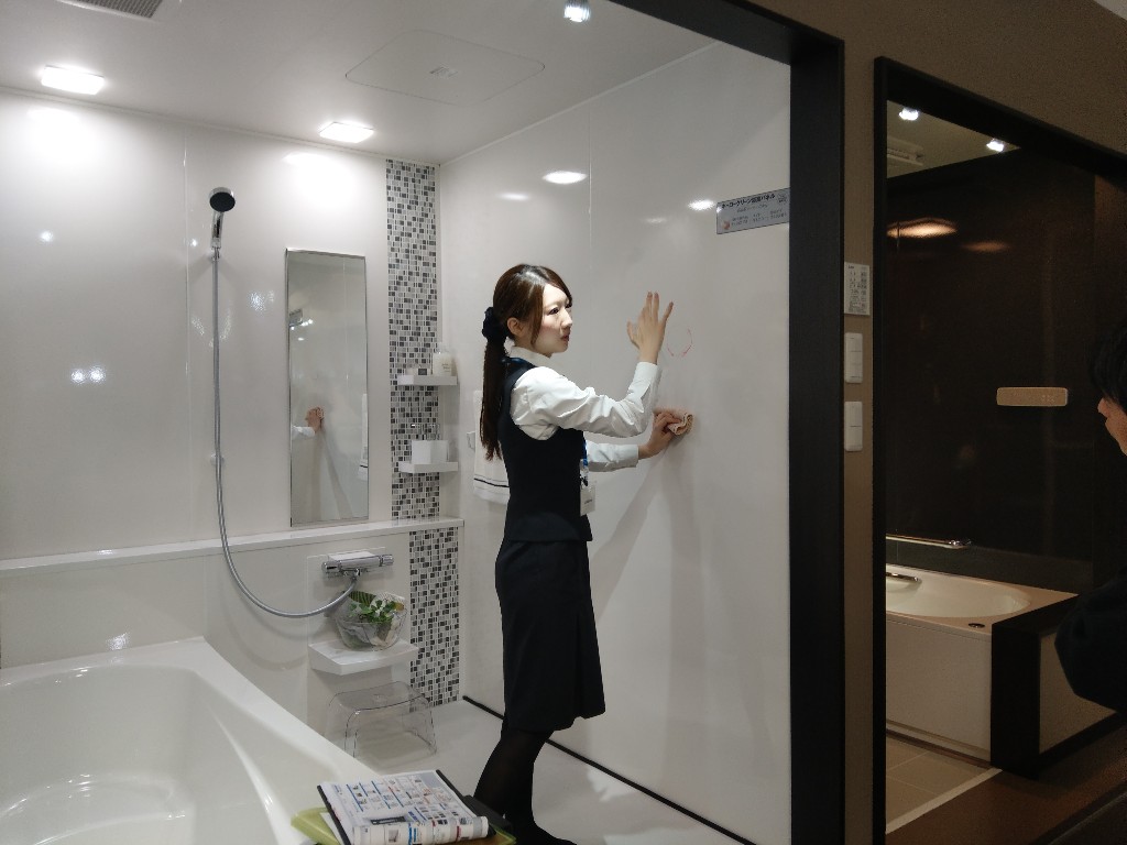 油性ペンを浴槽の壁に書き、水で洗い流してる実演です