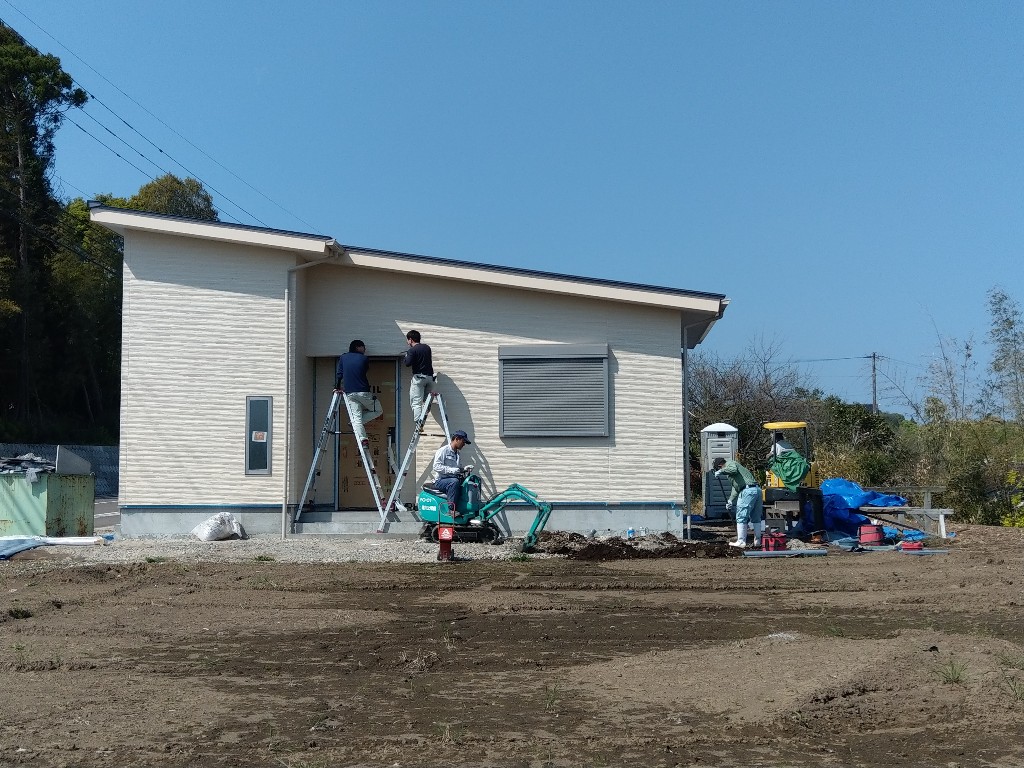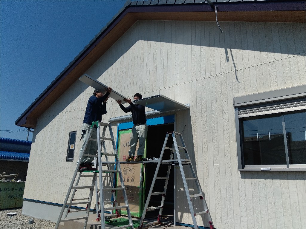 早速、玄関庇の取り付けと外部の給排水工事が