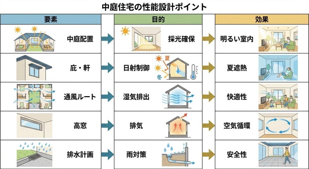 中庭住宅では、建物配置が採光と通風性能を左右します。南側や上部から光を取り込み、風の通り道を確保することで、室内環境が安定します。
