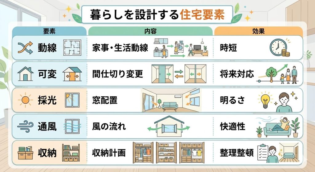まず大切なのは生活動線です。キッチン・洗面・ランドリーなどの家事動線を効率化することで、日々の暮らしが大きく変わります。次に重要なのが空間の柔軟性です。間仕切りを変更できる設計にすることで、子どもの成長や家族構成の変化に対応できます。