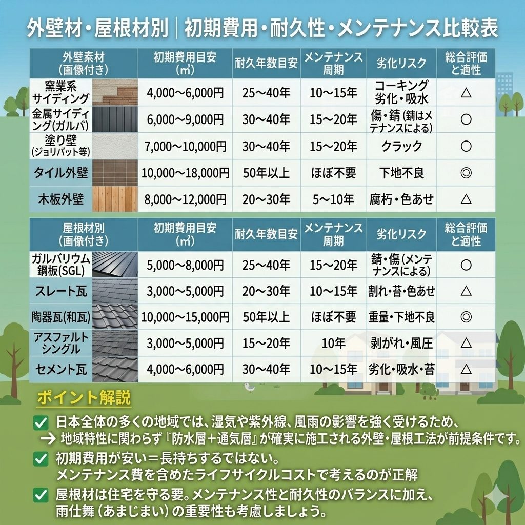 つまり、全国標準の素材選びではなく、地域特性に適した素材選定がメンテナンス負担を大きく左右します。