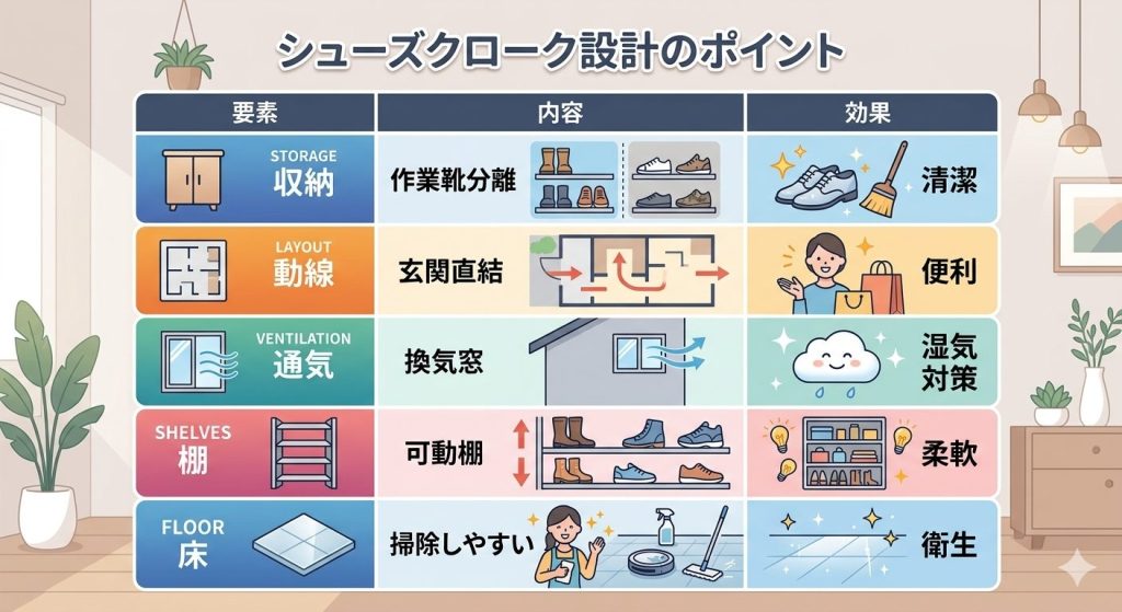 シューズクロークは配置によって使いやすさが大きく変わります。玄関からの移動がスムーズであるほど、収納が習慣化されます。
