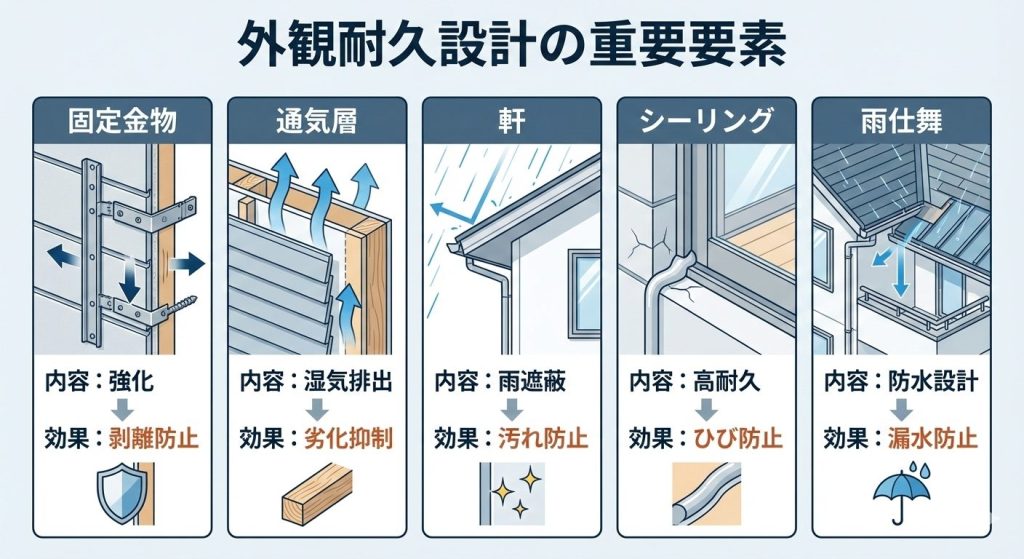 これらを想定した素材・色・構造選定が長寿命外観につながります。