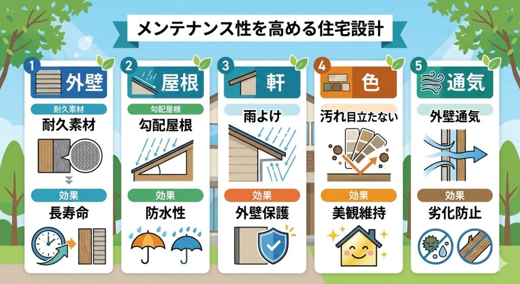 外壁や屋根の素材、設備の配置などによって、将来の維持費が変わる可能性があります。