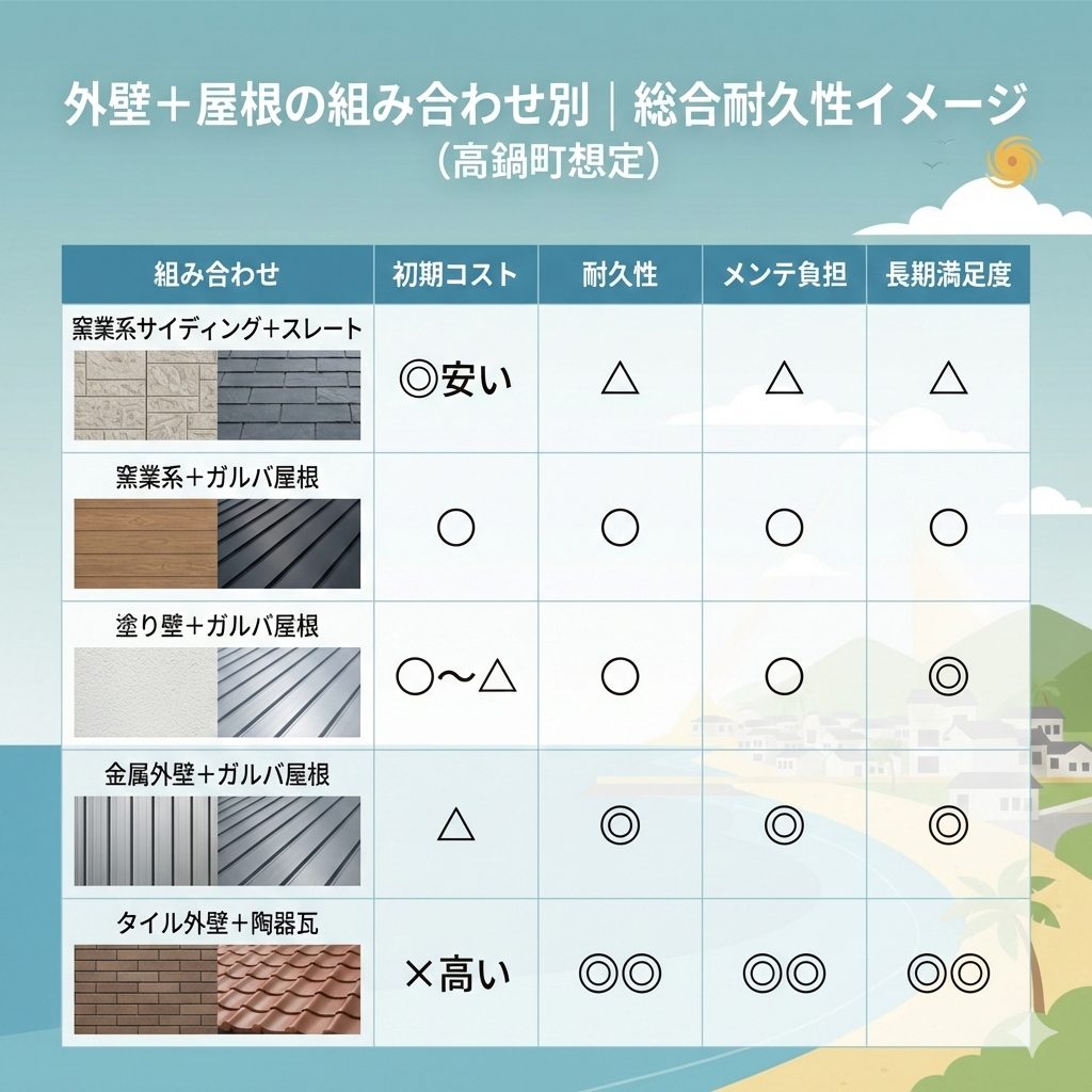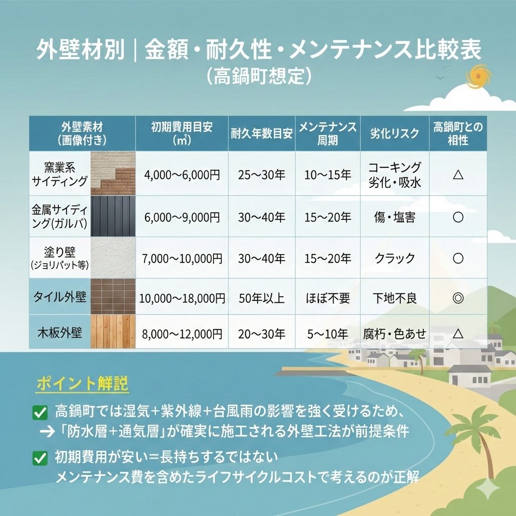 高鍋町では、湿気・紫外線・塩分に強い素材を適材適所で使うことが重要です。