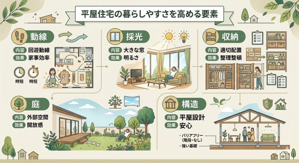 これらの要素を組み合わせることで、快適でゆとりある平屋住宅が実現します。