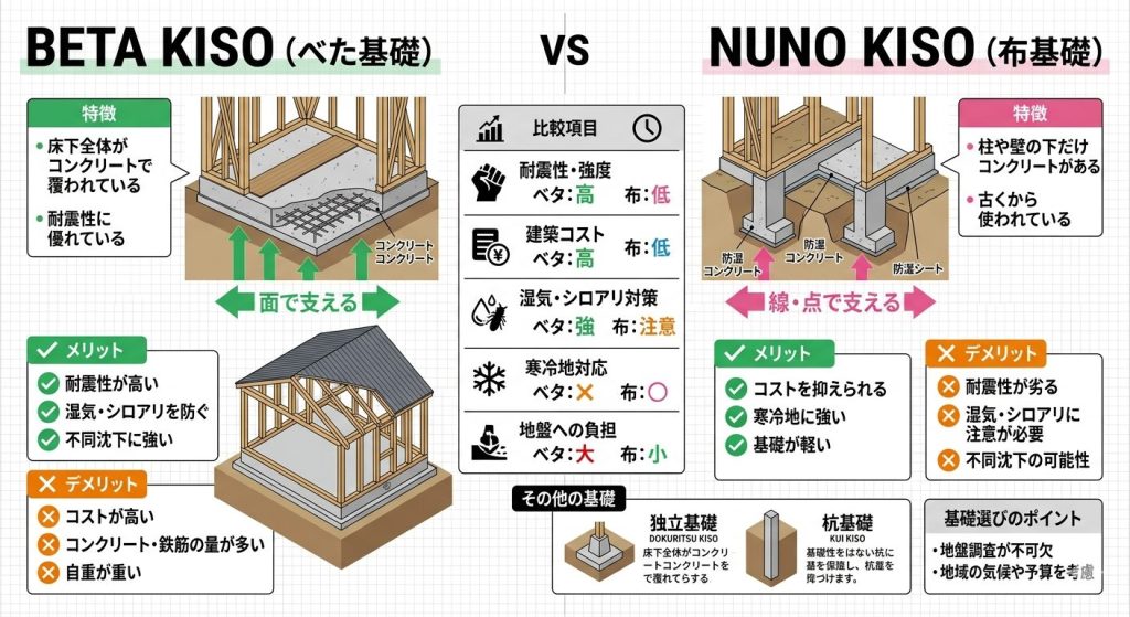 近年の住宅ではベタ基礎が多く採用されており、建物の荷重を面で支えることで安定性を高めることができます。