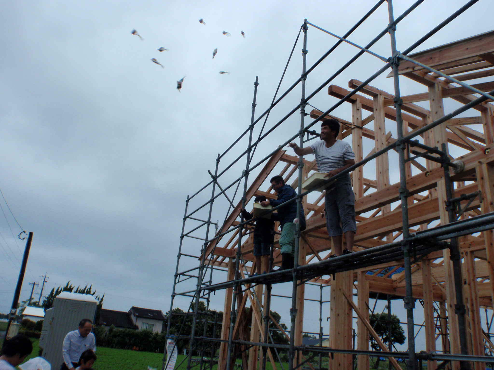 台風の影響で屋根から・・・とはいきませんでしたが、無事、上棟式とせんぐまきもできました(^^♪